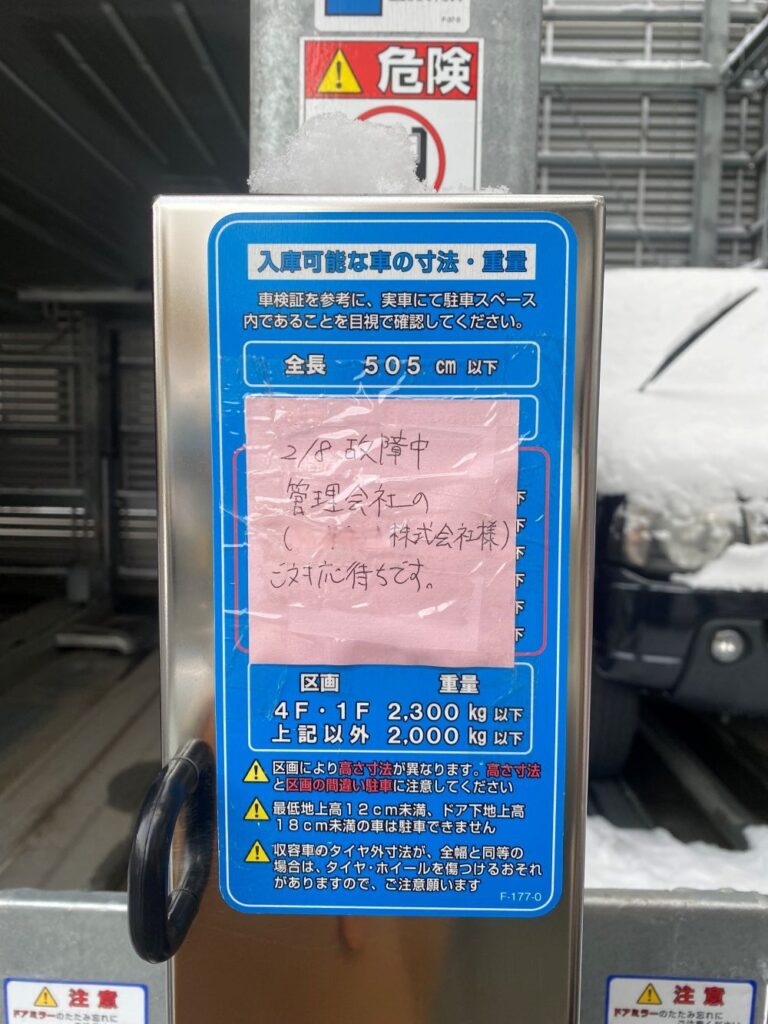 翌日のお出かけ前に用事を済ましてしまおうと機械駐車場にいくと、何やら張り紙が…